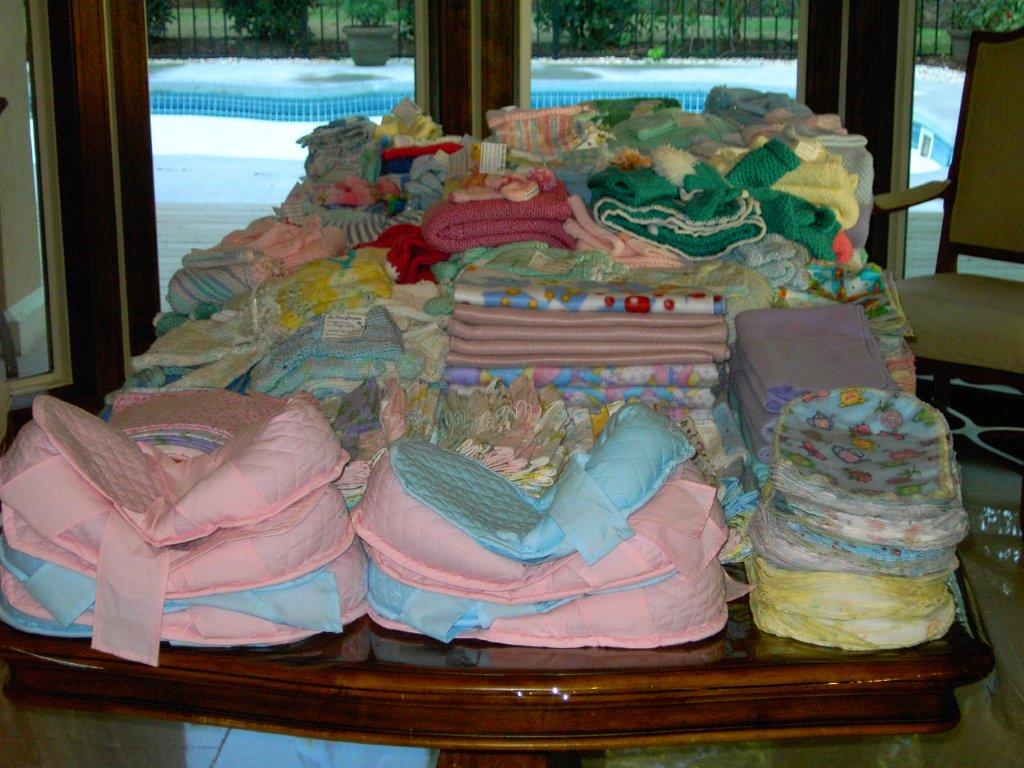Sewed items: 74 gowns, 10 coddlers, 200 protect coddlers, 46 protect sheets, 18 fleece blankets.